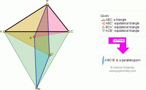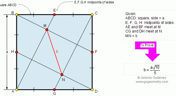 From Gogeometry : Using : Congruent triangles ΔABE is congruent to ΔBCF by rotation of pi/2 => <AGF=90° Define H as the middle of AB and K as the middle of AG By construction HD//BF AH=HB=>AK=KG <AGF=90° => <AKD=90° ΔDKG is congruent to ΔDKA (SAS) =>DG=DA Therefore a=b